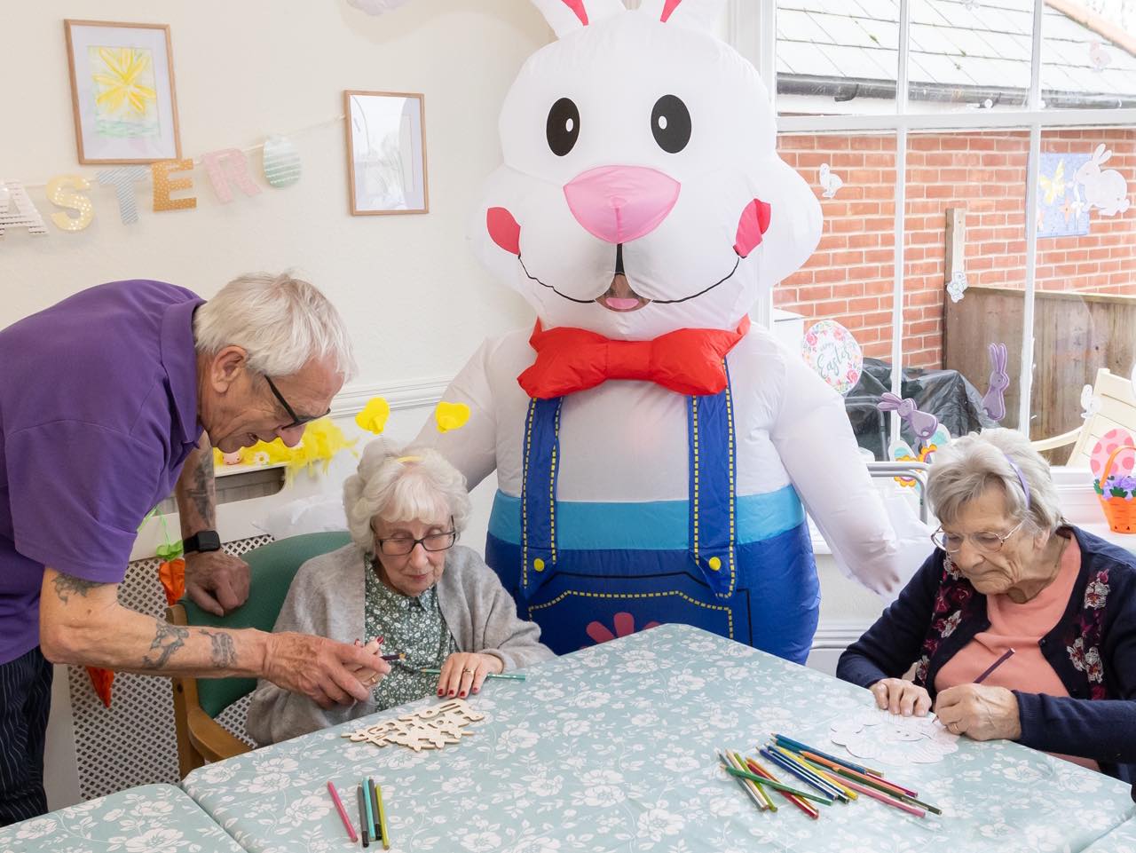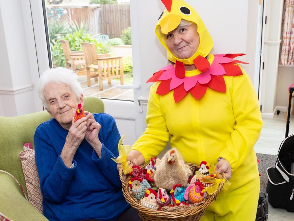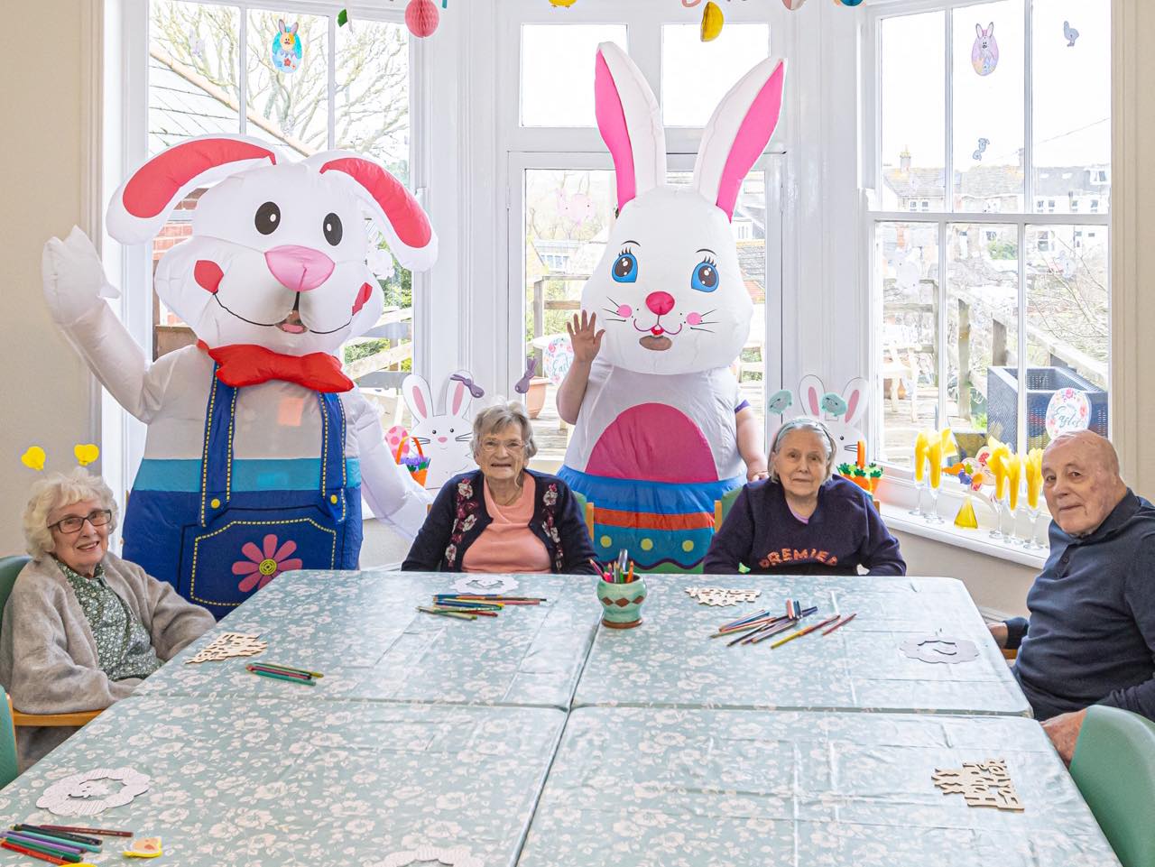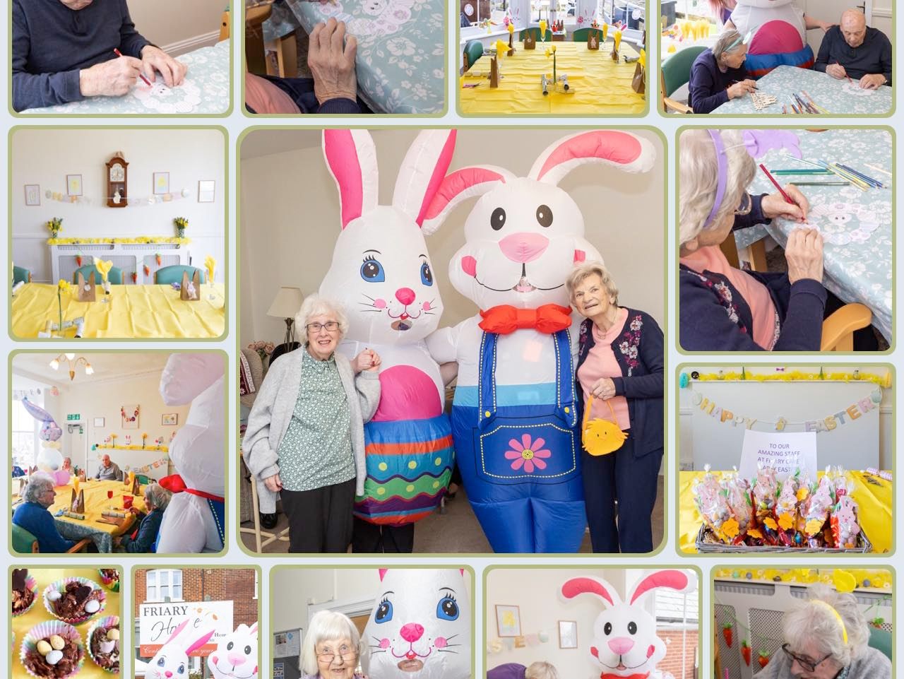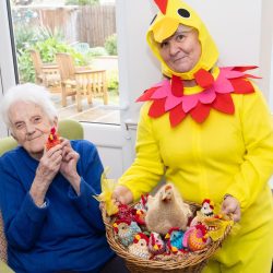 But we’ve also had some visitors this year! Two very friendly bunnies (who may or not be in inflatable costumes!), and also a very friendly chicken, have hopped over to Friary to wish us all a very happy Easter! We’ve had so many laughs with them and they have put smiles on the faces of all of our residents – but also on the faces of our residents’ families!