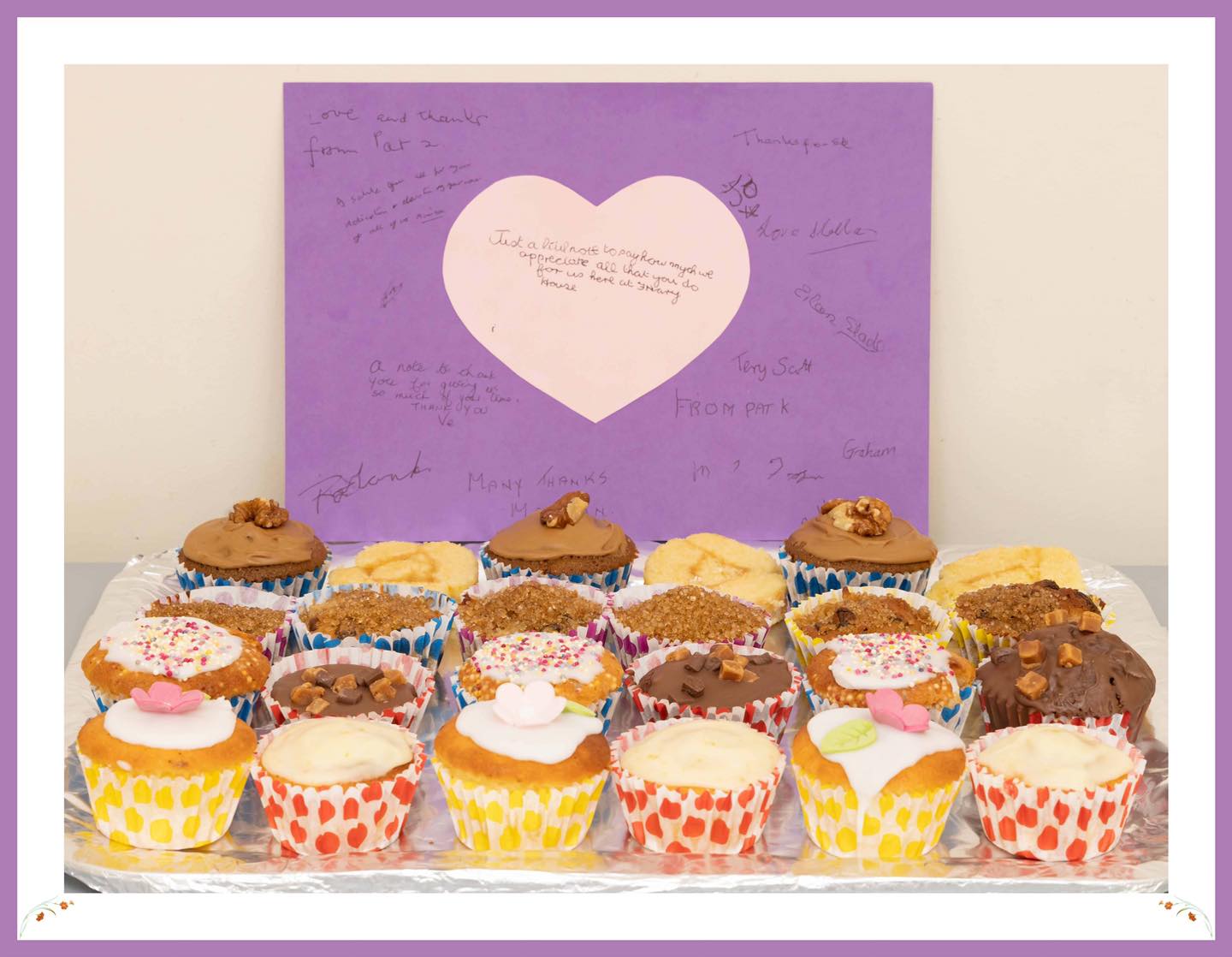 In order to show our appreciation the staff and residents have made a series of gifts to the district nurses team. To say thank you we’ve baked a variety of homemade cakes, put together a ‘chocolate bouquet’, and most importantly a very personalised thank you card made by all the residents.